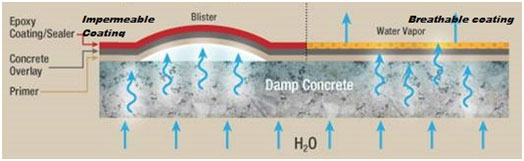 The second major source of moisture in a slab-on-ground is that which originates below the slab. When an effective vapor barrier/retarder material has not been properly installed directly beneath the concrete, moisture vapour from below the slab will migrate upward to, and into the concrete which will cause blistering and bond failure if not treated before installing the new epoxy floor.